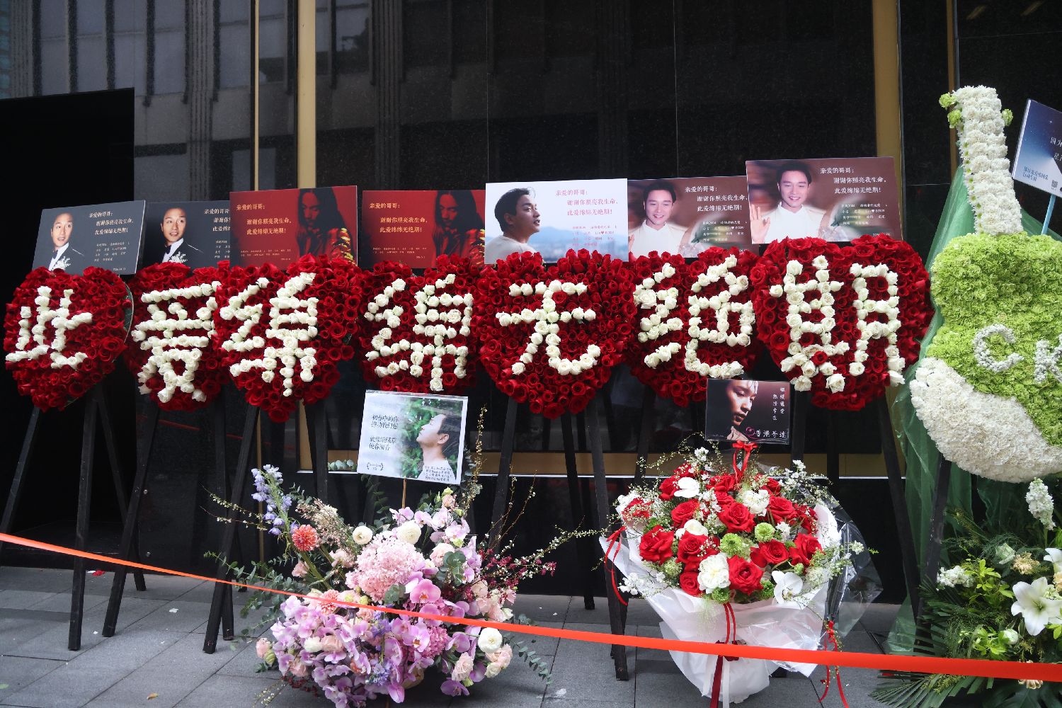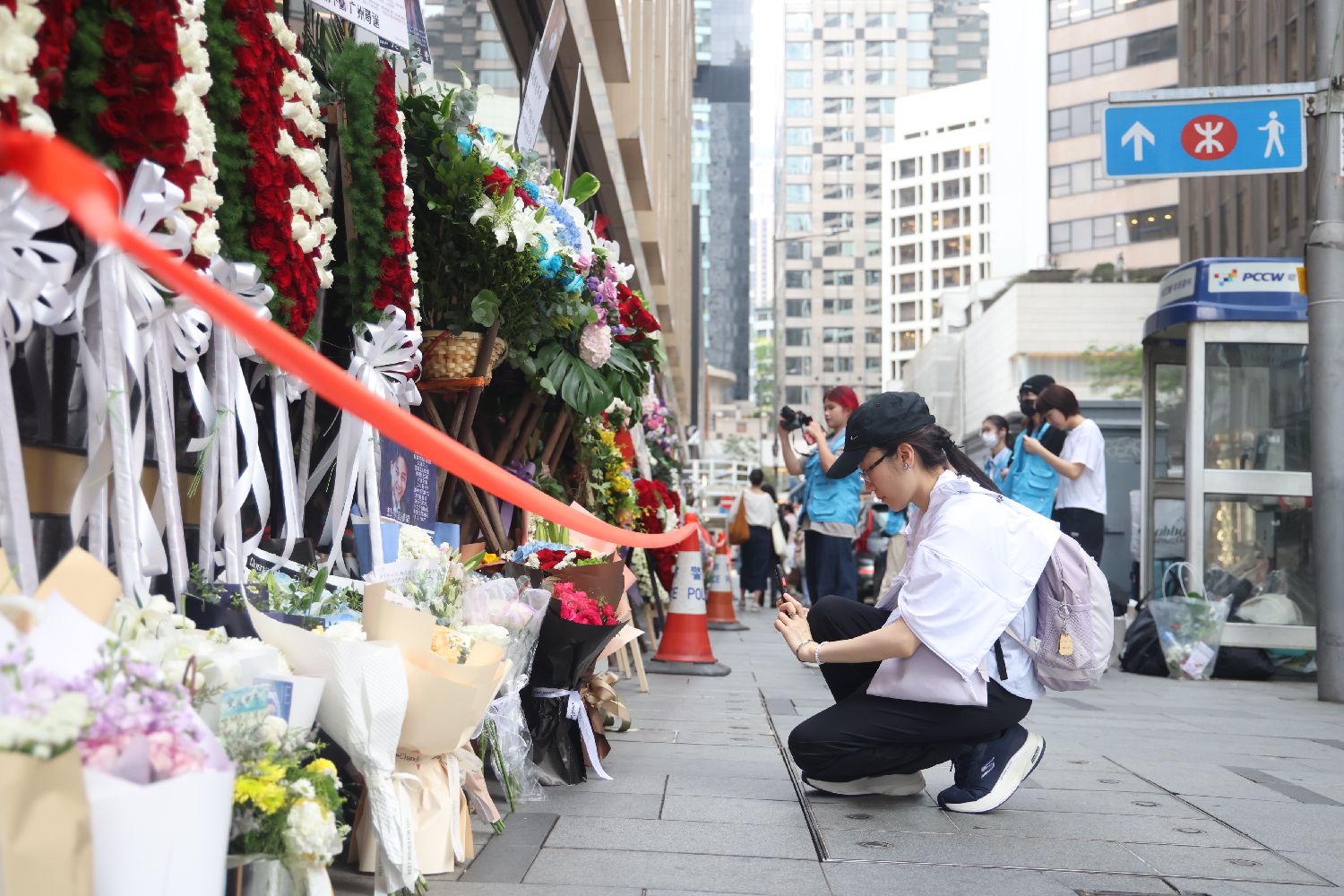 3月31日,香港文华东方酒店外人行道摆满鲜花、花牌与纪念展板,用以纪念张国荣逝世23周年。尽管正式忌日为4月1日,已有部分市民和来自各地的歌影迷提前抵达现场并拍照悼念。(香港中通社)