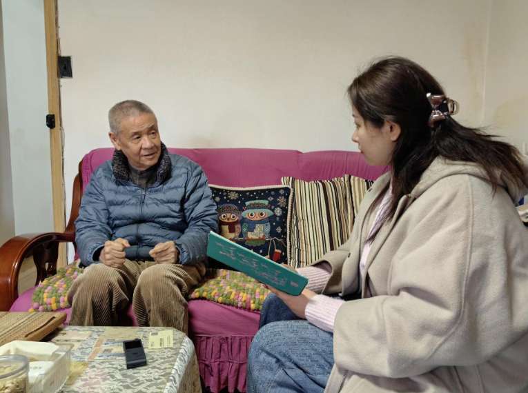 近日,侨眷王弘毅在上海市普陀区的家中与新侨范卓然(右)讲述家族往事。(图/中新社)