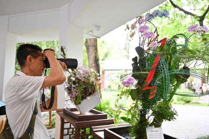 4月20日,广州市兰圃展出的粤港澳精品花艺吸引游客拍照。(中新社)