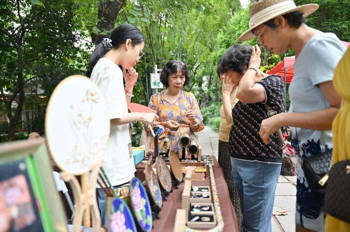 4月20日,广州市兰圃的景泰蓝饰品摊位吸引游客。(中新社)